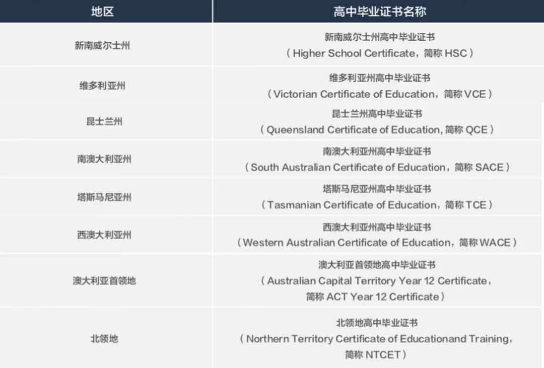 通过高考的学生便可获得各州与领地颁发的高中毕业证书,每个州与领地的高中毕业证书名称各不相同: